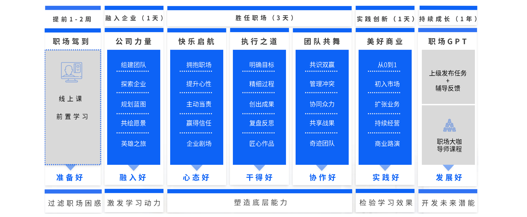 清晰的目标:结果导向,为新员工提供全面系统的职场通关训练,助力快速适应企业文化和工作环境,提升工作效率和职业素养。