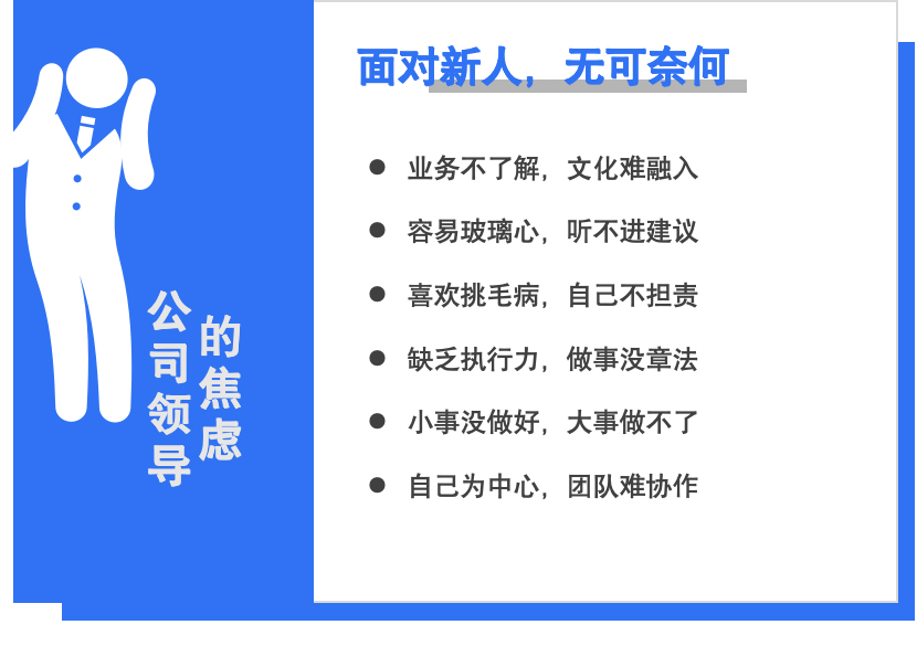 一直以来,新员工培训都在面临着“缺乏创新”和“效果不理想”等难题,传统的“课程拼凑式”的新员工培训已经很难满足当下新员工人才发展的需求,流于形式的各种培训活动,并不能真正把新员工培养成人才。我们需要对企业学习进行创新和变革,要更深入的促进新员工对企业的高度认同和融合,要以人才发展作为底层的逻辑,包括培养其积极稳定的心理素质、在工作中拿到结果的成事方法/习惯、与团队协同成为靠谱的合作伙伴的格局/方法以及对商业和对企业经营管理的系统认知和思考。